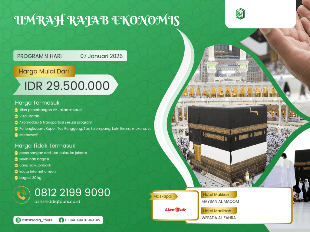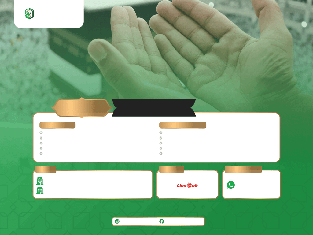 - Perlengkapan : Koper, Tas Punggung, Tas Selempang, kain ihram, mukena, sandal, tas sandal, buku bimbingan manasik, kain seragam hijau, kain seragam batik, syal, topi, botol, dan kaos.