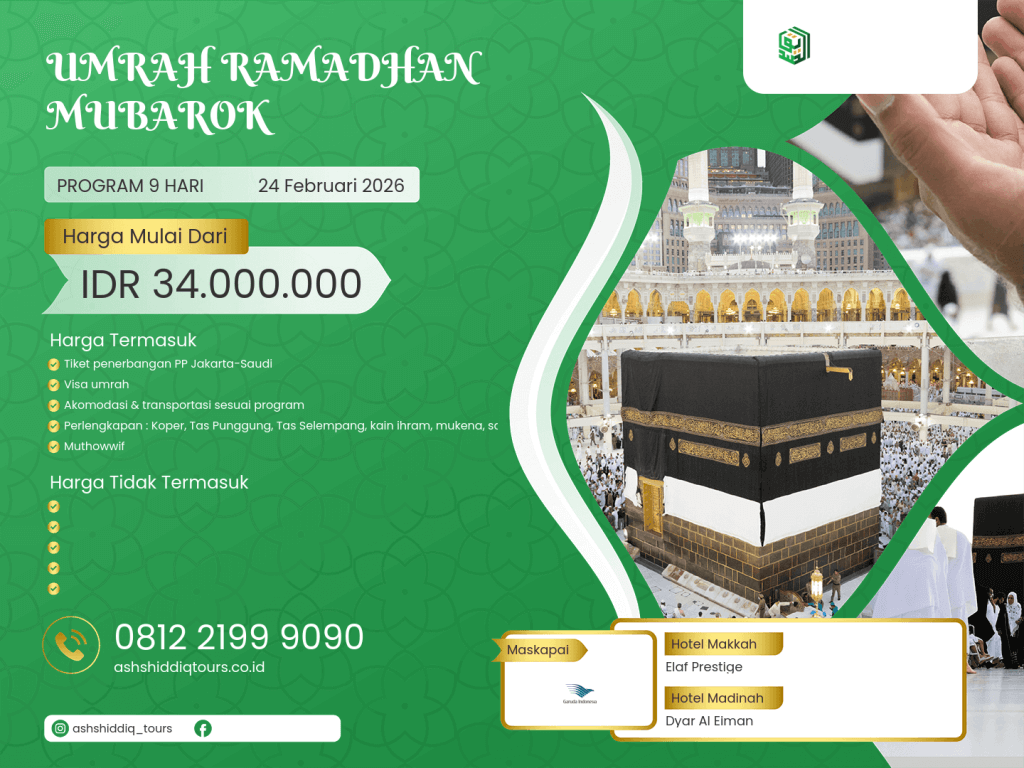 - Perlengkapan : Koper, Tas Punggung, Tas Selempang, kain ihram, mukena, sandal, tas sandal, buku bimbingan manasik, kain seragam hijau, kain seragam batik, syal, topi, botol, dan kaos.