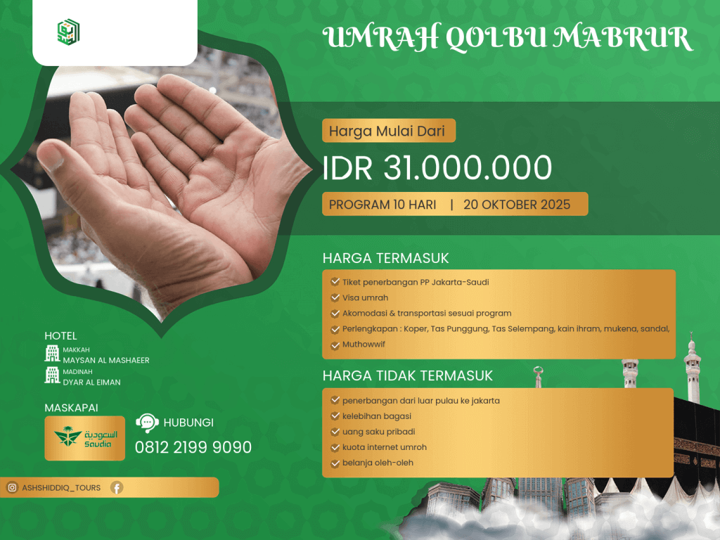 - Perlengkapan : Koper, Tas Punggung, Tas Selempang, kain ihram, mukena, sandal, tas sandal, buku bimbingan manasik, kain seragam hijau, kain seragam batik, syal, topi, botol, dan kaos.